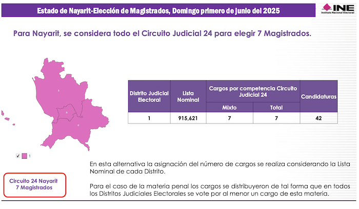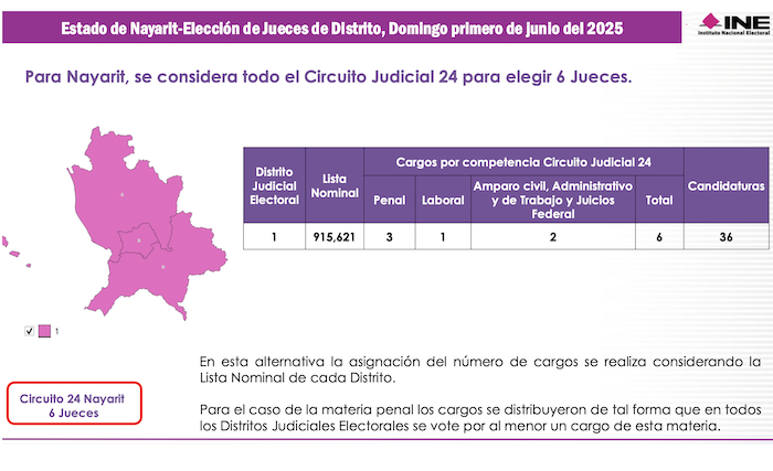 Con poco más de 900 mil votantes potenciales en su Lista Nominal de Electores, Nayarit es uno de los estados más pequeños de la República, que en elecciones ordinarias tiene solo 3 disteritos electorales. Sin embargo, para las elecciones judiciales su territorio fue compactado en una sola demarcación que equivale al Vigésimo Cuarto Circuito Judicial y a un Distrito Judicial Electoral, en los cuales se votará por 7 Magistrados de Circuito y 6 Jueces de Distrito.