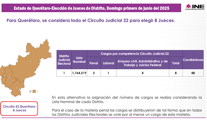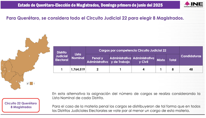 En estado de Querétaro tiene seis distritos electorales federales, pero fue compactado en una sola demarcación territorial que incluye el Vigésino Segundo Circuito Judicial y al mismo tiempo, un Distrito Judicial Electoral. Hay que recordar que cada estado de la República representa un Circuito Judicial y que los jueces y magistrados que sean electos en cada uno de ellos, sólo podrán trabajar en esa entidad federativa. En Querétaro se elegirán 8 Magistrados de Circuito y 8 Jueces de Distrito.