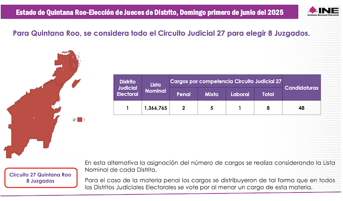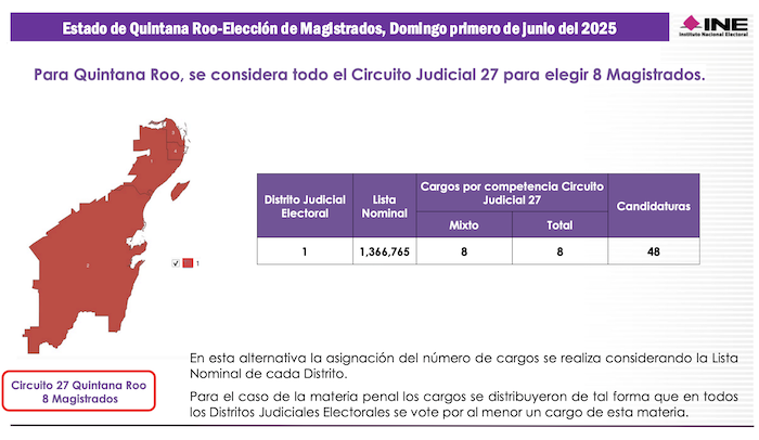El estado de Quintana Roo representa el Vigésimo Séptimo Circuito Judicial del país, en el cual serán electos 8 Magistrados de Circuito. Aunque en los comicios ordinarios el estado está dividido en 4 distritos federales, para las elecciones del Poder Judicial su territorio será una sola demarcación denominada Distrito Judicial Electoral en el cual se sufragará por 5 Jueces de Distrito.