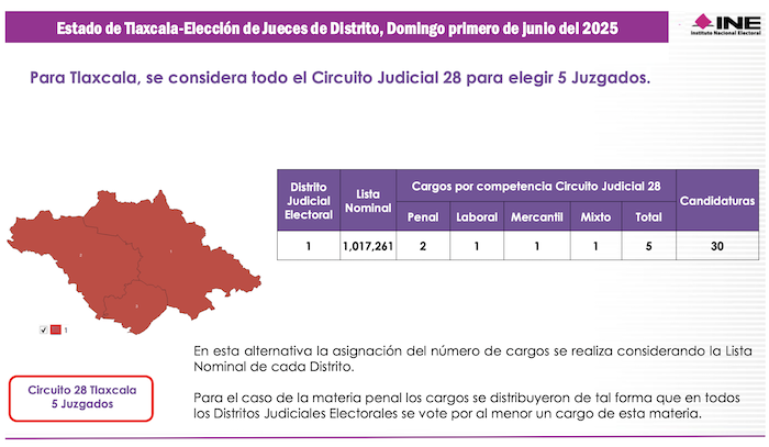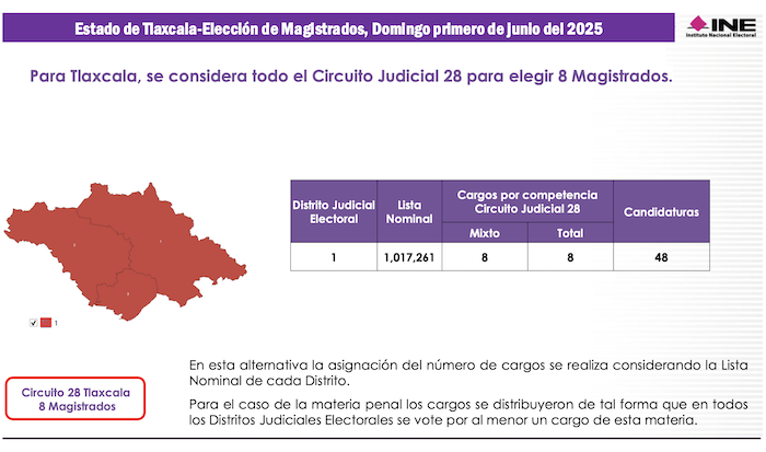 Con una Lista Nominal de Electores que apenas rebasa el millón de potenciales votantes, Tlaxcala es sede del Vigésimo Octavo Circuito Judicial en donde el primero de junio del 2025 se elegirán 8 Magistrados de Circuito. Con solo 3 distritos federales en las elecciones ordinarias, Tlaxcala será compactado en una sola demarcación denominada Distrito Judicial Electoral, en el cual se votará por 5 Jueces de Distrito.