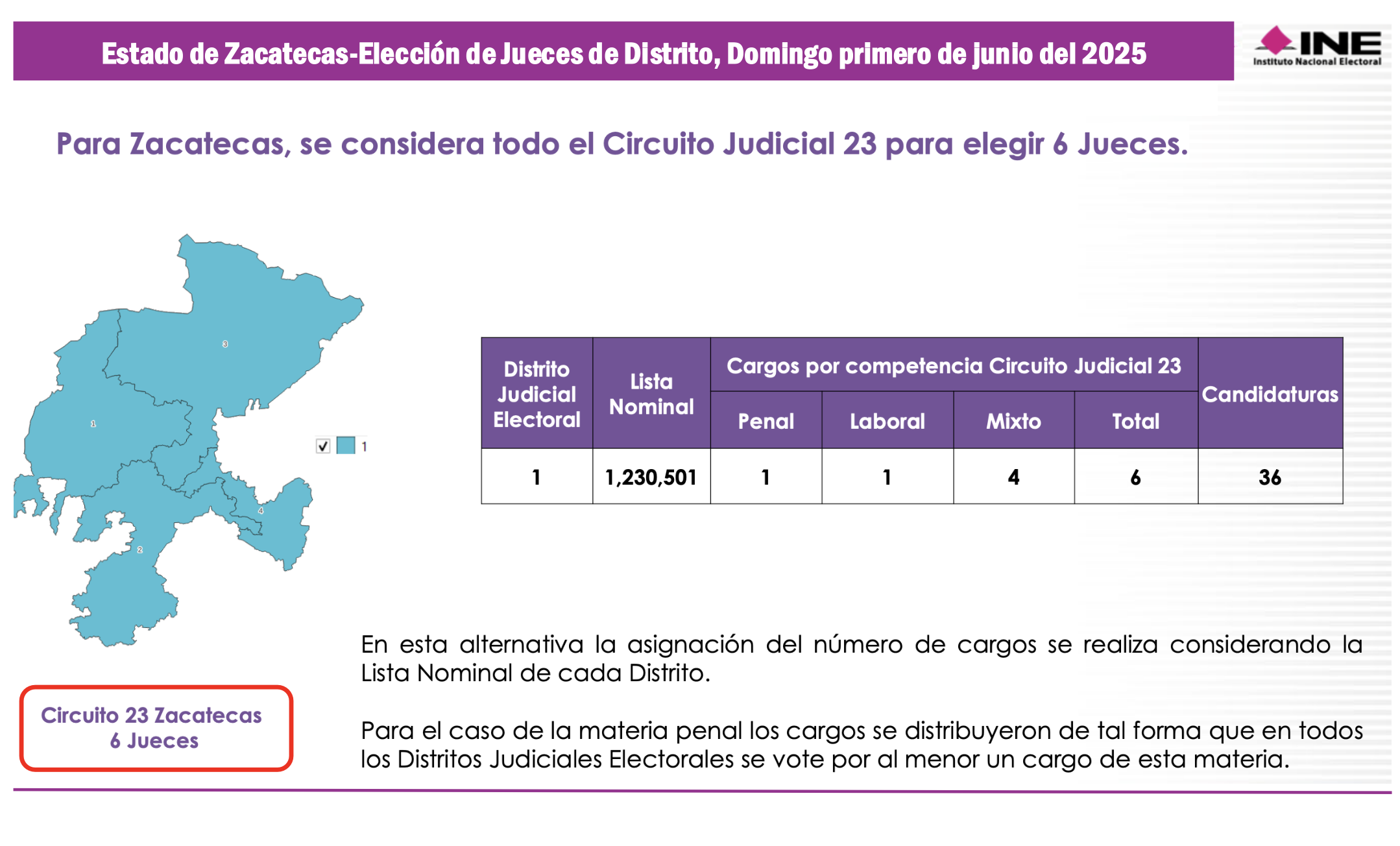 En los comicios ordinarios el estado de Zacatecas cuenta con 4 distritos electorales federales, que fueron compactados, para la elección judicial, en una sola demarcación territorial, que incluye, al mismo tiempo, el Vigésimlo Tercer Circuito Judicial y un Distrito Judicial Electoral, en el cual se votará en junio por 5 Magistrados de Circuito y 6 Jueces de Distrito.