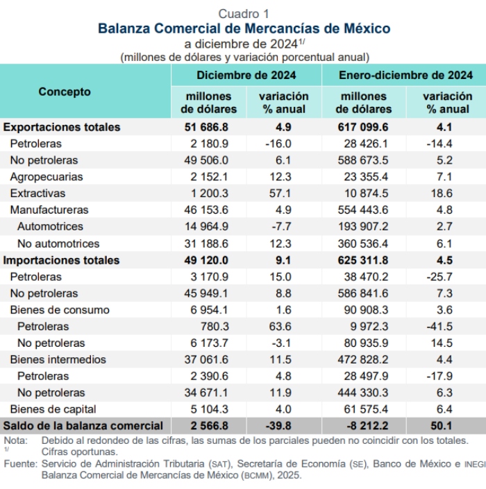 "En diciembre de 2024, la información oportuna de comercio exterior indicó un superávit comercial de dos mil 567 millones de dólares. Dicho saldo se compara con el déficit de 133 millones de dólares reportado en noviembre", explicó en Instituto en un comunicado.