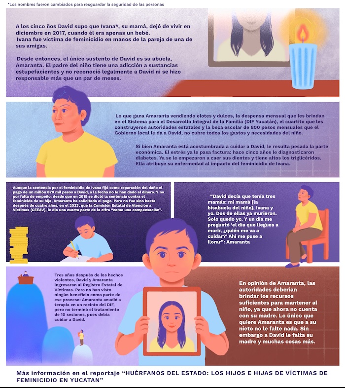 La historia de David y Amaranta no es la única. Tan solo de enero de 2018 a marzo de 2024, en Yucatán al menos 37 niñas, niños y adolescentes quedaron en orfandad por feminicidio. Y especialistas han identificado patrones que apuntan a que esas hijas e hijos quedan en el limbo, pues no es prioridad del Estado restituir los derechos de quienes son víctimas indirectas de la violencia de género.