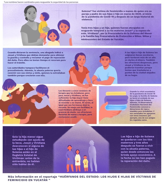 Las hijas e hijos de víctimas de feminicidio no solo enfrentan el dolor de la pérdida de sus madres. Si no cuentan con una red familiar sólida, son enviados a alguna institución de asistencia social. Actualmente en Yucatán hay una niña de 6 años y un niño de 12 en un Centro de Asistencia Social del Estado en esta condición, de acuerdo con la Procuraduría de Protección de Niñas, Niños y Adolescentes de Yucatán (Prodennay). Si bien esta acción en ocasiones es necesaria, lo cierto es que en esos sitios también se presenta violencia.