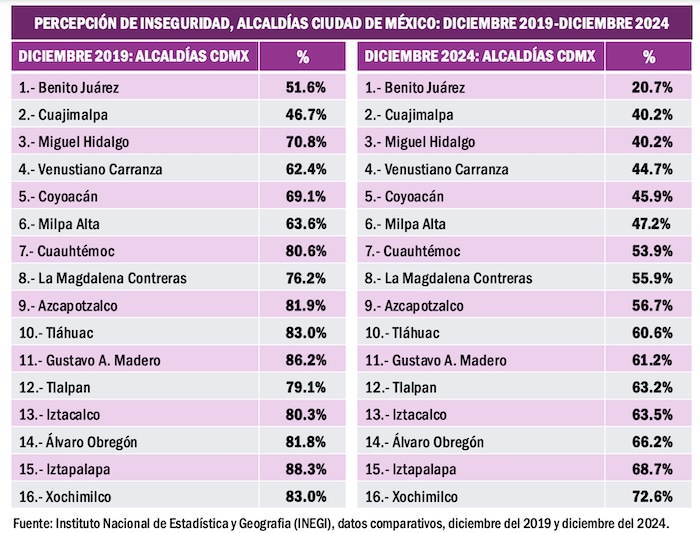 Algunos ejemplos: en la Alcaldía Benito Juárez la percepción de inseguridad bajó de 51.6 a 20.7 por ciento; en la Miguel Hidalgo el descenso fue del 70.8 al 40.2 por ciento; en Azcapotzalco disminuyó la percepción de inseguridad de 81.9 a 56.7 por ciento; en Tláhuac bajó del 83 al 60.6 por ciento.
