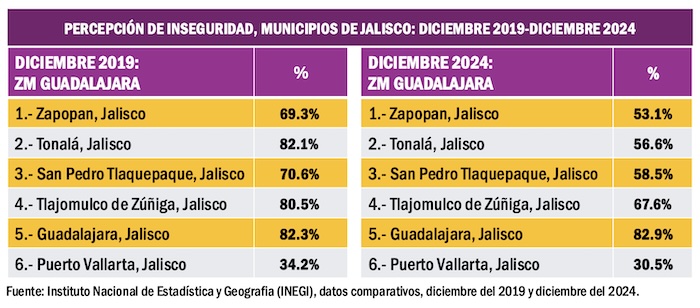 En los principales municipios de la zona metropolitana de Guadalajara también ha habido un sensible descenso en la percepción de inseguridad entre 2019 y 2024. En Zapopan bajó del 69.3 al 53.1 por ciento; en Tonalá, la caída en la percepción de inseguridad fue de 82.1 a 56.6 por ciento; mientras que en Tlaquepaque descendió del 70.6 al 58.5 por ciento.
