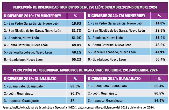 Otra entidad con índices de percepción de inseguridad razonablemente bajos y estables ers Nuevo León. San Pedro Garza García aparece con los índices más bajo de percepción de inseguridad de todo el país desde 2019 y le siguen San Nicolás de los Garza y Apodaca. También son muy razonables los índices de inseguridad que reflejan Santa Catarina, General Escobedo y Guadalupe. Donde la situación se ha complicado es en Guanajuato, pues los índices de percepción de inseguridad en diciembre del 2024 son muy altos: 66.4 por ciento en la ciudad de Guanajuato; 80.8 por ciento en León y 84.5 por ciento en Irapuato.