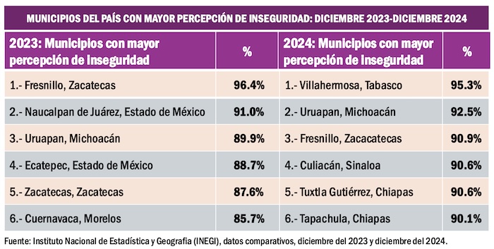 Fresnillo, Zacatecas, bajó del primer lugar en 2023 al tercer lugar en 2024. Hay ciudades que siguen apareciendo en la lista de las seis urbanizaciones del país en las cuales sus habitantes se sienten más inseguros, como son los casos de Fresnillo, Zacatecas y Uruapan, Michoacán. Se incorporó a esta lista del miedo en 2024 la ciudad de Culiacán, Sinaloa, pero dejaron de aparecer en ella Naucalpan de Juárez y Ecatepec, dos ciudades del Estado de México.