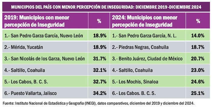 En la lista de las seis ciudades que sus habitantes consideran más seguras ocupan un lugar especial San Pedro Garza García, Nuevo León; la alcaldía Benito Juárez, de la Ciudad de México y Los Cabos, Baja California Sur. En la medición de diciembre del 2024, Piedras Negras, Coahuila, aparece en segundo lugar con una percepción de inseguridad de la población del 18.7 por ciento, cuatro puntos por debajo del primer lugar como la ciudad más tranquila del país que ocupa San Pedro Garza García, Nuevo León, con solo el 14.0 por ciento de percepción de inseguridad.