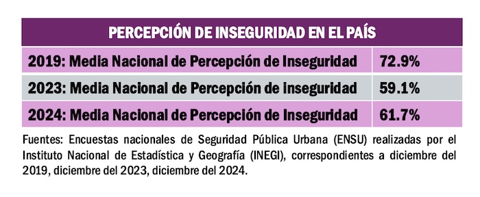 Según resultados de la Encuesta Nacional de Seguridad Pública Urbana realizada por el Inegi, en diciembre del 2024 la percepción de inseguridad pasó del 72.9 por ciento al 61.7 por ciento.