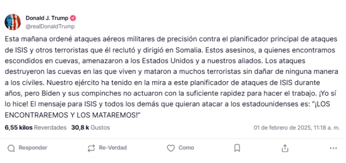 "¡Yo sí lo hice!", exclamó Trump en su publicación. Además, envió un mensaje claro a ISIS y a cualquier otro grupo que intente atacar a los estadounidenses: "¡LOS ENCONTRAREMOS Y LOS MATAREMOS!"