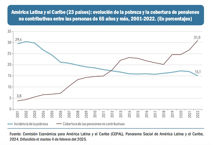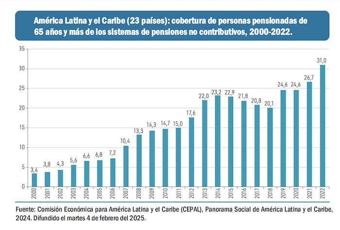 Pone énfasis la CEPAL en explicar que “la expansión de los sistemas de pensiones no contributivos representa uno de los principales hitos en el proceso de fortalecimiento de los sistemas de protección social en la región, especialmente si se consideran los altos niveles de informalidad laboral y las amplias brechas y desigualdades en los sistemas de pensiones. De esta forma, se ha identificado que su cobertura ha crecido del 3.4 por ciento de las personas de 65 años y más en 2000, equivalente aproximadamente a un millón de personas mayores, al 31 por ciento de esta población en 2022, equivalente a 19.6 millones de personas”.