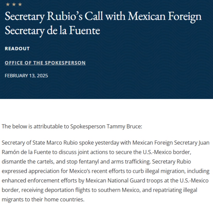 El Secretario de Estado Marco Rubio habló ayer con el Secretario de Relaciones Exteriores de México, Juan Ramón de la Fuente, para discutir acciones conjuntas para asegurar la frontera entre Estados Unidos y México, desmantelar los cárteles y detener el tráfico de fentanilo y armas. El Secretario Rubio expresó su aprecio por los recientes esfuerzos de México para frenar la migración ilegal, incluyendo la intensificación de las medidas de control por parte de las tropas de la Guardia Nacional mexicana en la frontera entre Estados Unidos y México, la recepción de vuelos de deportación al sur de México y la repatriación de migrantes ilegales a sus países de origen", señaló la portavoz Tammy Bruce en una declaración oficial.