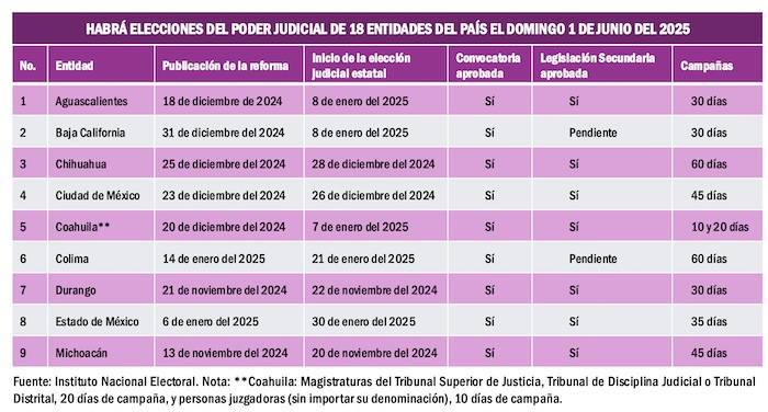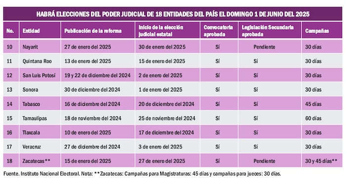 La reforma al Poder Judicial también llegará a los tribunales de justicia de por lo menos 18 entidades del país, en los cuales ya están programados comicios locales para el primer domingo de junio del 2025.