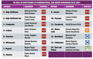 Las gubernaturas de Morena que estarán en juego en junio del 2027 son Baja California, Baja California Sur, Campeche, Colima, Guerrero, Michoacán, Nayarit, Sinaloa, Sonora, Tlaxcala y Zacatecas. Se renovarán los gobiernos panistas de Querétaro y Chihuahua, lo mismo que la administración de Movimiento Ciudadano en Nuevo León y la del Partido Verde Ecologista de México en San Luis Potosí.