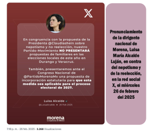 En las primeras horas de la noche de este miércoles 26 de febrero del 2025 la presidenta nacional de Morena, Luisa María Alcalde publicó un mensaje en la red social X en el que avierte: “En congruencia con la propuesta de la Presidenta Claudia Sheinbaum sobre nepotismo y no reelección, nuestro Partido-Movimiento NO PRESENTARÁ propuestas de familiares en las elecciones locales de este año en Durango y Veracruz”.