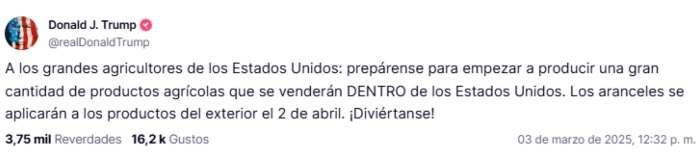 "A los grandes agricultores de Estados Unidos: prepárense para empezar a aumentar la producción para venderla dentro de Estados Unidos. Los aranceles se aplicarán a los productos exteriores el 2 de abril. ¡Diviértanse!", publicó Trump en su cuenta en Truth Social.