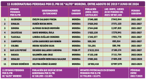 Cuando “Alito” tomo la dirigencia del PRI, el Revolucionario Institucional tenía 12 gubernaturas. En 2021 perdió ocho; entregó dos más en 2022, aunque ganó Durango, con una pequeña ayuda de sus amigos del PAN y PRD; y finalmente, en el 2023, el PRI entregó la joya de la corona, la gubernatura del Estado de México, pero logró salvar Coahuila, con los votos de respaldo de PAN y PRD. En su marcha tenaz hacia el abismo, el 11 de agosto del 2024, luego de manipular los estatutos de su partido, Moreno Cárdenas logró reelegirse por cuatro años más, hasta el 2028, con la posibilidad de prolongar su dictatorial mandato hasta el año 2032.