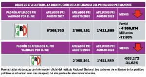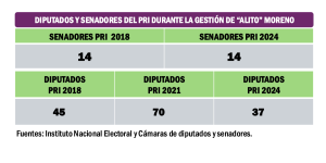 Mientras la izquierda crecía, el PRI se desmoronaba, a tal grado en que en las más recientes elecciones del 2024 apenas logró 5 millones 736 mil 759 votos en los comicios presidenciales, en respaldo de la candidatura de Xóchitl Gálvez, postulada como candidata común con PAN y PRD. Apenas el 9.54 por ciento de los sufragios totales captados en las urnas fueron para el tricolor.