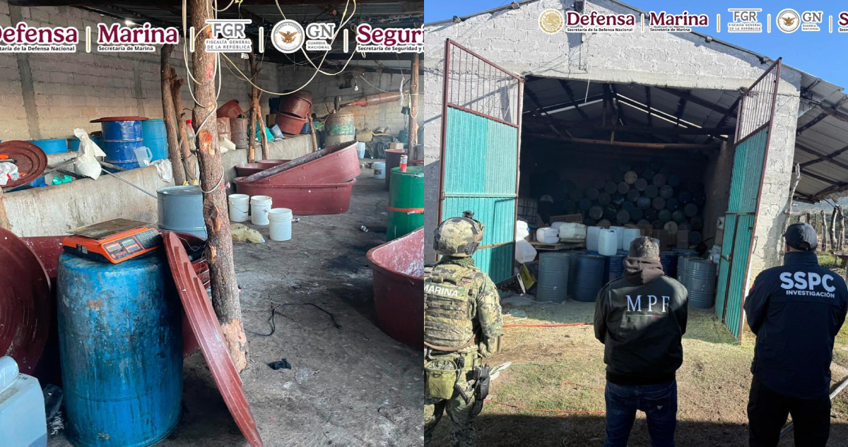 De acuerdo con las Secretaria de Seguridad y Protección Ciudadana (SSPC), en el lugar se aseguraron 105 bidones con químicos de 50 litros aproximadamente, 18 tinas color café, tres mezcladoras, siete ollas de peltre, dos básculas, tres batidoras, una olla para mezclar y 19 costales de peróxido.