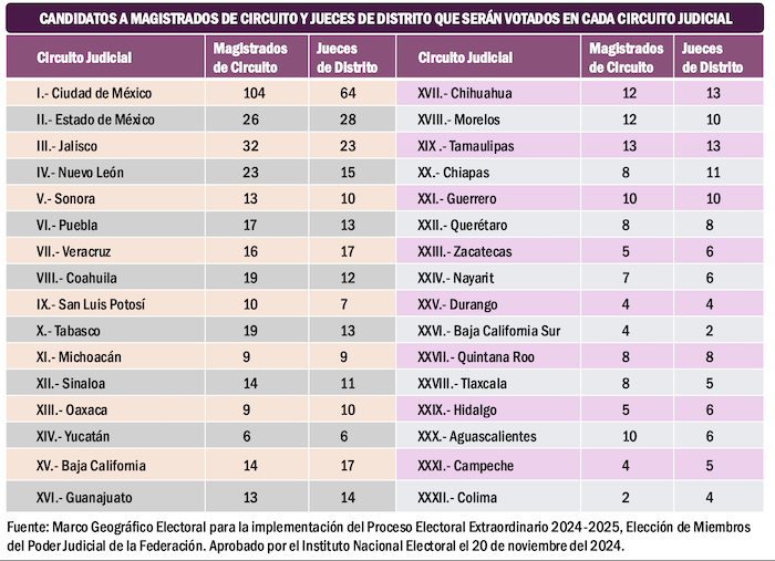 El número de candidatos a jueces de distrito y a Magistrados de Circuito será muy diferente en cada Circuito Judicial. Como le hemos informado, cada Circuito Judicial corresponde a cada uno de los 32 estados de la República. El número de magistrados y jueces que se elegirán variará de acurdo con el tamaño y la población de cada entidad federativa.