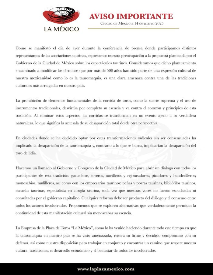 Ante ello, hizo un llamado al Gobierno y Congreso de la Ciudad de México para abrir un diálogo con todos los actores involucrados en la tauromaquia, como ganaderos, toreros, novilleros, rejoneadores, empresarios taurinos, peñas, bibliotecas taurinas y especialistas en cirugía taurina.