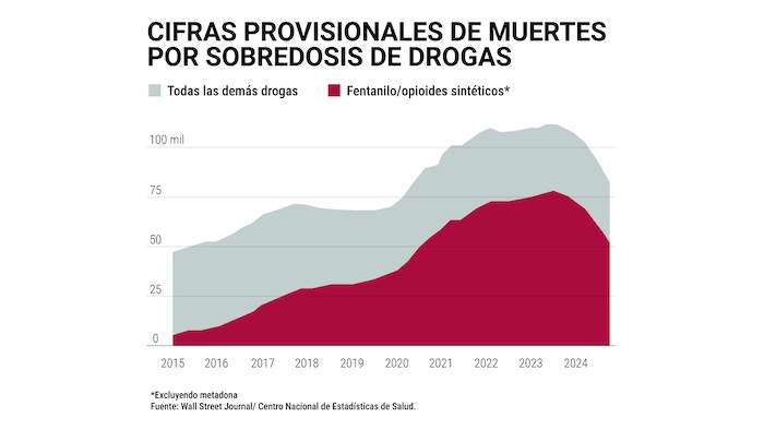 ¿El factor principal?, se pregunta The Wall Street Journal en un amplio artículo divulgado hoy. La disminución del número de muertes relacionadas con opioides sintéticos, una clase de droga en la que el fentanilo de contrabando es la principal causa de muerte, responde.