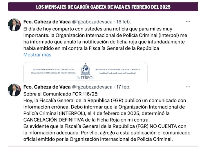 Hoy, la Fiscalía General de la República (FGR) publicó un comunicado con información errónea. Debo informar que la Organización Internacional de Policía Criminal (INTERPOL), el 4 de febrero de 2025, determinó la CANCELACIÓN DEFINITIVA de la Ficha… pic.twitter.com/gBPvP3tqjN— Fco. Cabeza de Vaca (@fgcabezadevaca) February 17, 2025