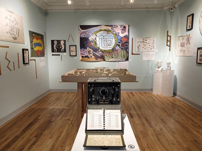 Las piezas creadas en los talleres artísticos del CEVAREPSI y Tepepan dialogan con objetos de la colección del MODO como cámaras fotográficas, un medidor de frecuencias, algunos mapas, entre otros.