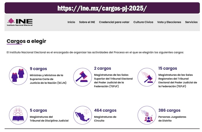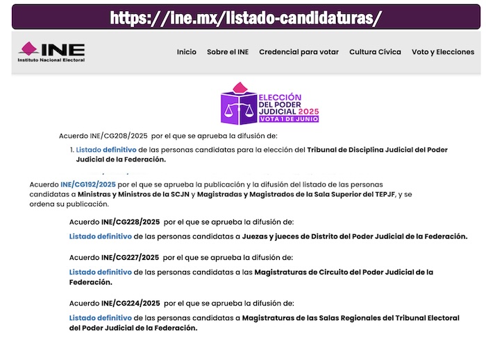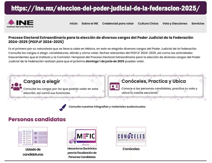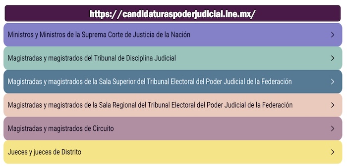 En el enlace dentro de la página oficial del INE denominado “candidaturas poder judicial” los ciudadanos podrán revisar los nombres de ministros, magistrados y jueces y ver todos sus antecedentes profesionales, su formación académica e incluso sus tres principales propestas para el desempeño de sus cartgos en caso de que les favorezca el voto de los ciudadanos. Las campñas de los candidatos a cargos en el Poder Judicial empezaron el pasado domingo 30 de marzo y terminarán el miércoles 28 de mayo del 2025.