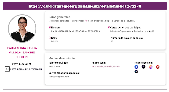 Otro ejemplo que podemos tomar es lo que dice Paula María García Villegas Sánchez Cordero, que pretende también ser electa ministra de la Suprema Corte de Justicia de la Nación: “Transparencia durante todo el procedimiento, protegiendo los datos sensibles, tal como se hace en la versión pública de las sentencias. Cercanía de la persona juzgadora con las personas justiciables. Rendición de cuentas y cero tolerancia a la corrupción. Garantizar ambientes libres de violencia. Adaptarse a los cambios tecnológicos y a las demandas de las nuevas generaciones. Buscar eliminar el papel y cambiar a sistemas electrónicos. Acceso efectivo a la justicia a través de sistemas digitales más eficientes, accesibles y sostenibles”.