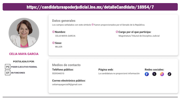 Ahora revisemos en la página del INE las propuestas de algunos aspirantes a magistrados del nuevo Tribunal de Disciplina Judicial. Por ejemplo, Celia Maya García, quien actualmente es integrante del Consejo de la Judicatura Federal. La señora Maya García dice que ella promoveré los valores, la ética, equidad, inclusión, bienestar colectivo con perspectiva de género. Señala que impulsará que las personas Juzgadoras estén capacitadas, que generen ambientes libres de violencia y en pleno cumplimiento de sus deberes de respeto; con independencia en su desempeño y sin presiones externas. Una persona juzgadora que no es libre, no puede ser justa. “Privilegiaré la implementación de mecanismos de prevención de faltas administrativas y de hechos de corrupción”, advierte Celia Maya.