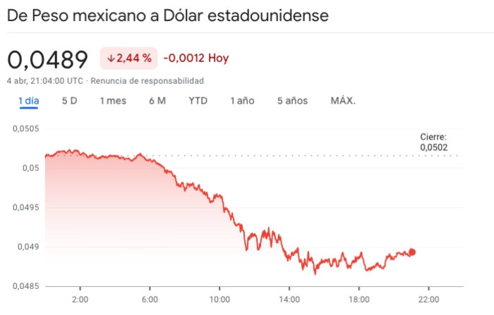 Hasta las 15:00 horas de este viernes, la cotización del billete verde marcaba 20.44 por unidad, luego de que China anunciara aranceles de 34 por ciento para todos los productos de Estados Unidos, lo que alentó el pesimismo respecto a una probable recesión económica a nivel mundial.