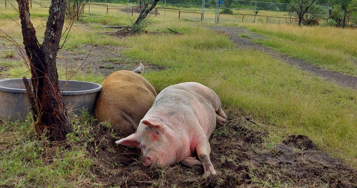 A lo lejos, su cuidadora humana sale a verlas, las saluda, Sally y Petunia reconocen su voz respondiendo con un suave y espontáneo gruñido.