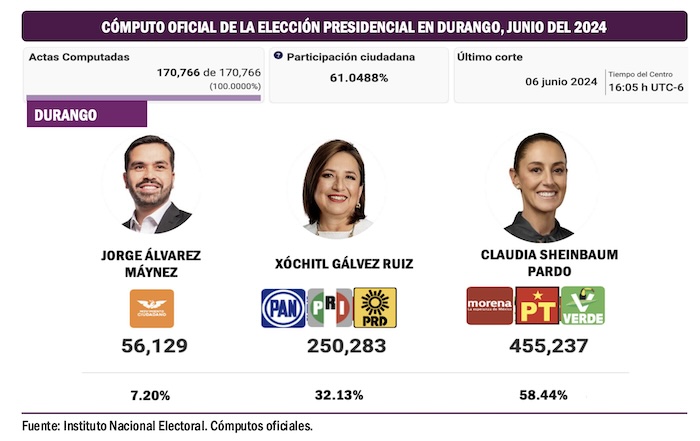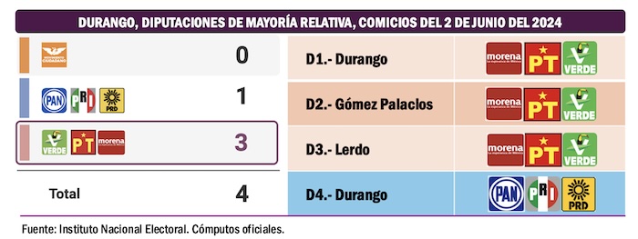 Antes de los comicios de junio del 2024, la presunción generalizada era que en Durango, juntos el PRI y el PAN serían una fuerza respetable, sin embargo, no pudieron imponerle condiciones a Morena y sus aliados. La coalición Sigamos Haciendo Historia ganó en los comicios tres de cuatro distritos electorales federales. También fueron para Morena y sus aliados los dos triunfos en la contienda por las senadurías de Mayoría Relativa en Durango. A esto habría que sumar que en la disputa por la presidencia de la República en esa entidad fue también amplia la victoria de la morenista Claudia Sheinbaum Pardo, con el 58.44 por ciento de los sufragios, por el 32.13 por ciento de la panista Bertha Xóchitl Gálvez Ruiz.