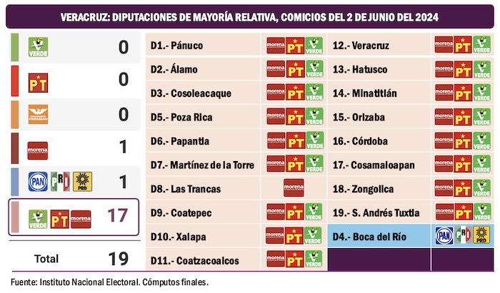 Los antecedente de los más reciente comicios favorecen en Veracruz a la alianza morenista. El triunfo de la coalición Sigamos Haciendo Historia en la contienda por los 19 distritos electorales federales en Veracruz fue aplastante en las elecciones del domingo 2 de junio del 2024, pues sumó 18 victorias por el Principio de Mayoría Relativa, por sólo una derrota frente a la coalición Fuerza y Corazón por México. En la contienda por las dos senadurías de Mayoría Relativa que se disputaron en Veracruz el triunfo fue para Morena y sus aliados, que también ganaron con amplias ventajas los comicios para la gubernatura y para la presidencia de la República.