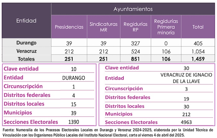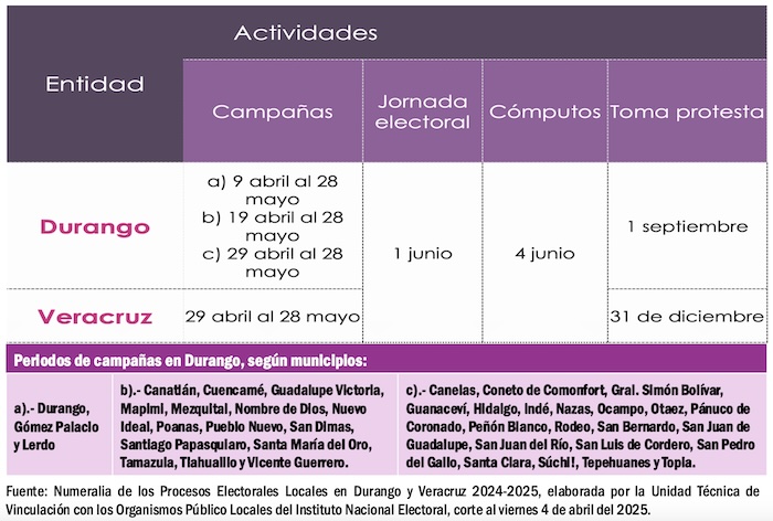 De acuerdo con el calendario oficial oficial, este miércoles 9 de abril del 2025 empezaron las campañas formales para las presidencias municipales de Durango, Gómez Palacio y Lerdo, las tres principales municipalidades del estado de Durango. En el resto de los municipios duranguenses, las actividades proselitistas será escalonadas, pues algunas contiendas empezarán el 19 de abril y otras el 29 de abril. Todas las campañas electorales en Durango terminarán el 28 de mayo del 2025. En Veracruz el inicio de las campañas formales, para las 212 alcaldía de la entidad, empezarán el 29 de abril y terminarán también el 28 de mayo del 2025.