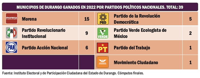 Los cuentas para la oposición fueron ligeramente favorables en los comicios del estado de Durango, en la contienda por las presidencias municipales del domingo 5 de junio del 2022, pues en tanto que Morena y sus aliados ganaron 18 alcaldías, PAN, PRI y PRD sumaron 20 de las 39 que estuvieron en disputa. Únicamente la alcaldía de San Pedro del Gallo fue ganada por Movimiento Ciudadano. Sólo que ahora, en 2025, el PRD prácticamente estará fuera de la contienda, pues en el 2024 perdió su registro como partido nacional, lo que podría inclinar la balanza en favor de la coalición Sigamos Haciendo Historia.