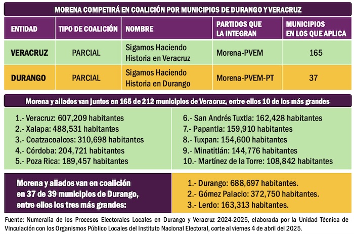 Para las elecciones municipales del domingo primero de junio del 2025, Morena en alianza con el Partido Verde, participará coaligados en la disputa de 165 de los 212 municipios que renovarán autoridades en Veracruz; mientras que, en el estado de Durango, la alianza Morena-PVEM-PT competirá por 37 de los 39 ayuntamientos de la entidad.