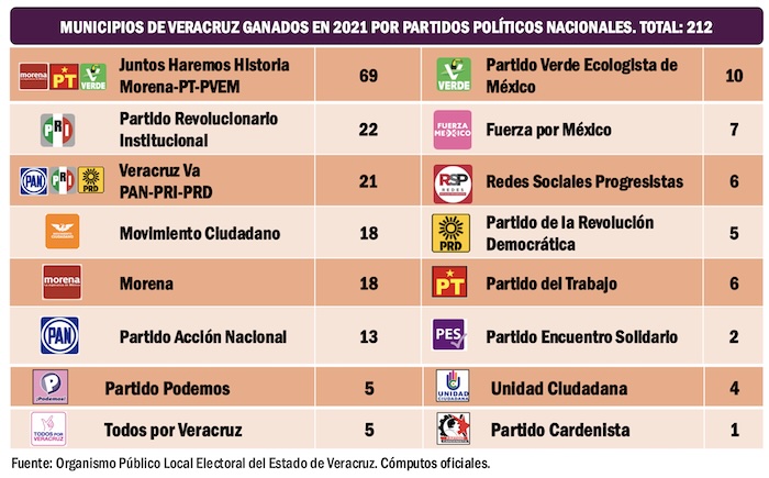 En Veracruz, Morena y sus aliados gobiernan actualmente 103 municipios de los 212 que tiene la entidad, mientras que sus opositores de PAN, PRI, PRD suman 61 alcaldías. El resto de las presidencias municipales están en poder de partidos nacionales que perdieron su registro en el 2021 y otras en manos de cuatro partidos estatales.