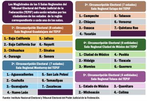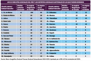 En noviembre del 2024 el Consejo de la Judicatura Federal) remitió al Instituto Nacional Electoral la división del territorio nacional por circuito judicial o circunscripción plurinominal electoral, indicando la entidad o las entidades federativas que abarcan, así como el número y materia de los Tribunales Colegiados de Circuito y Tribunales Colegiados de Apelación o Juzgados de Distrito que tienen residencia en cada circuito judicial, y la sede de las salas regionales del Tribunal Electoral.