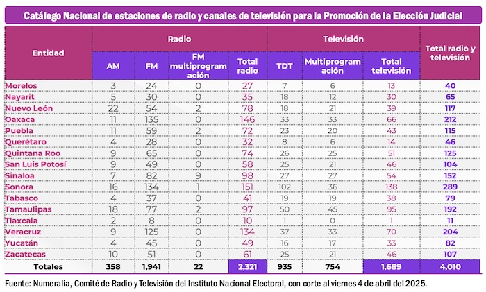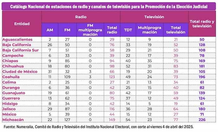 El Comité de Radio y Televisión del Instituto Nacional Electoral seleccionó en todo el país dos mil 321 estaciones de radio que transmitirán los promocionales, de la autoridad y de los candidatos, en los comicios judiciales. También se integró un catálogo de mil 689 estaciones de Televisión para el mismo propósito. En total, entre estaciones de Radio y Televisión habrá en el país cuatro mil 10 estaciones dándole difusión a la elección del Poder Judicial. Los estados en los cuales será más intensa la campaña promocional de los comicios judiciales serán Sonora, con 289 estaciones; Oaxaca, con 2012; Michoacán, en 226; Coahuila, con 196 y Jalisco con 180.