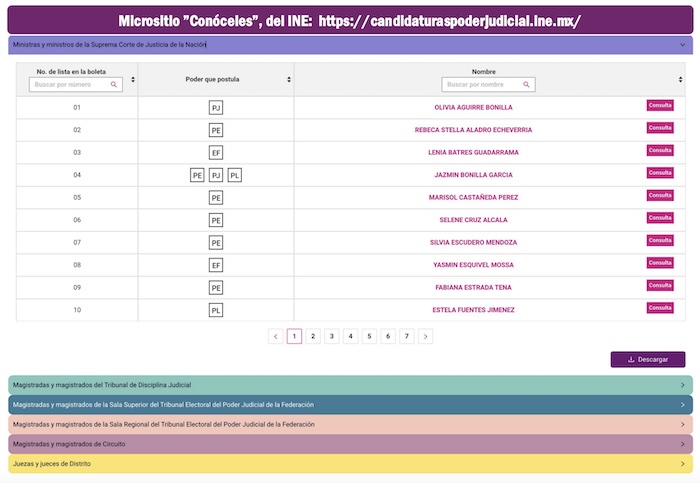 El Instituto Nacional Electoral (INE) tiene habilitado en su plataforma digital un micrositio denominado “Conóceles” en el cual se pueden consultar todos los antecedentes, de todos los candidatos, a Ministros, Magistrados y Jueces.