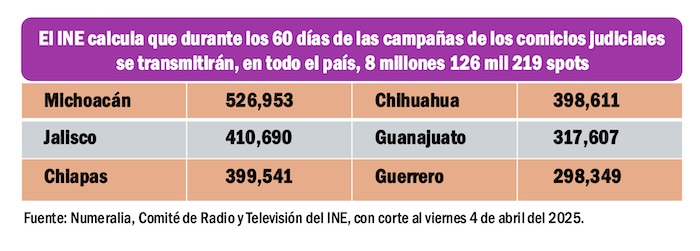 Los estados en donde la población será más agobiada por promocionales de la elección judicial son Michoacán con 526 mil 953 spots; Jalisco con 410 mil 690 promocionales; Chiapas, con 399 mil 541 mensajes sobre los comicios judiciales; Chihuahua con 398 mil 611 spots; Guanajuato con 317 mil 607 y Guerrero con 298 mil 349 mensajes promocionales sobre la campaña judicial.