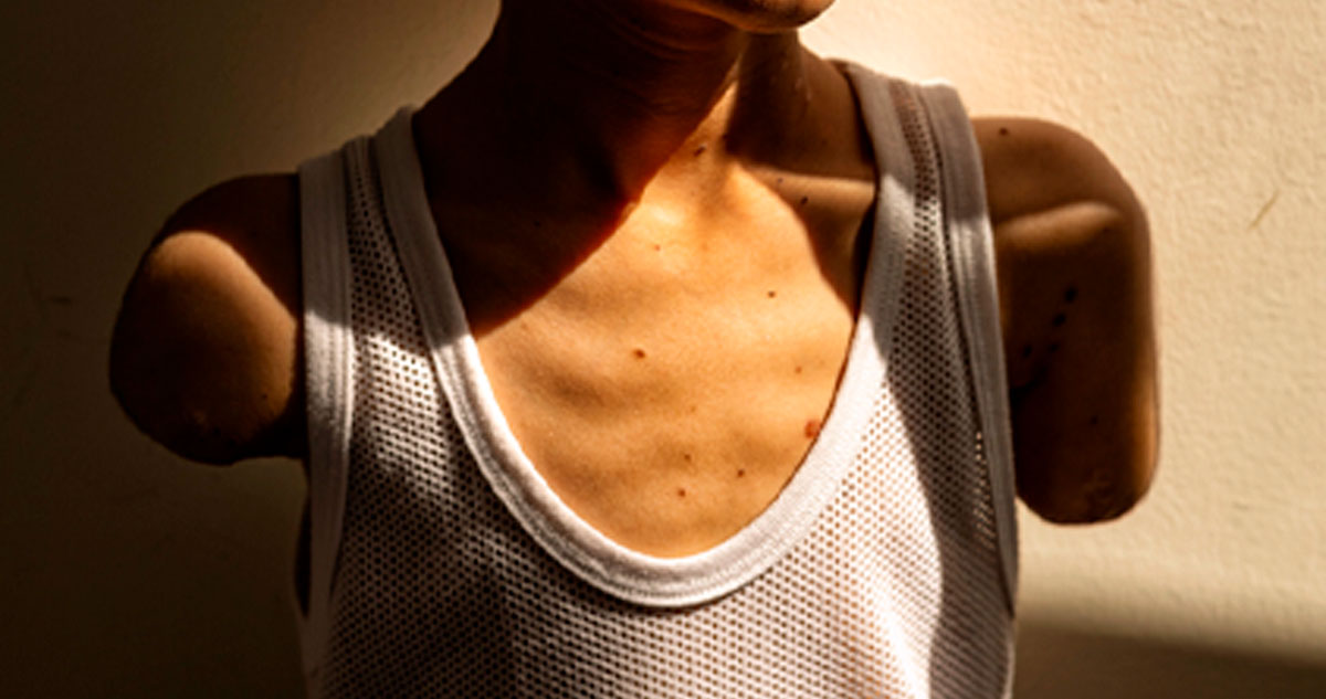 La imagen galardonada muestra a Mahmoud Ajjour en camiseta con sus brazos mutilados. Mientras su familia huía de un ataque israelí, el menor regresó para animar a los demás a seguir adelante. Una explosión le amputó un brazo y mutiló el otro, según informó la Fundación World Press Photo en su página web.
