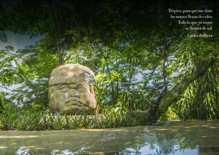 De entrada, la portada, el cuadro de Carlos Pellicer López, dialoga con la poesía de Pellicer y con el sueño del Museo La venta, “con versos milenarios, encuadernados en misterio”, como si el espacio mismo del parque-museo tuviera las características de un libro, de encuadernación magnífica.