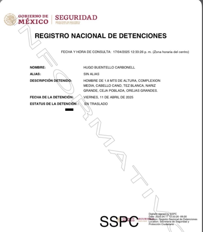 Según información del Registro Nacional de Detenciones, Hugo Buentello, exfuncionario de Segalmex, fue detenido el pasado viernes 11 de abril. Foto: Registro Nacional de Detenciones.