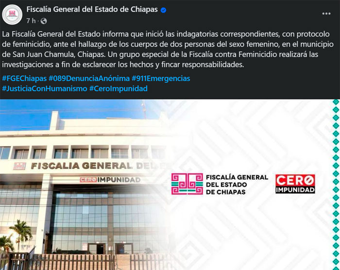 La Fiscalía General del estado (FGE) de Chiapas informó sobre el incidente a través de una publicación en redes sociales, donde dio a conocer que "inició las indagatorias correspondientes, con protocolo de feminicidio, ante el hallazgo de los cuerpos de dos personas del sexo femenino".