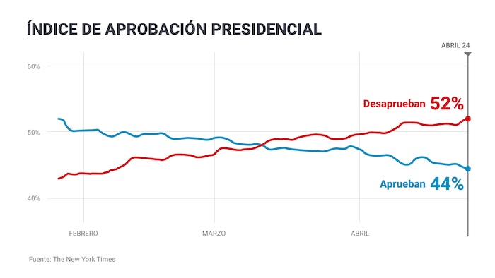 “Las encuestas muestran una ligera disminución en su apoyo entre los votantes republicanos. Gran parte de la disminución en la aprobación proviene de los votantes que se identifican como independientes, según una encuesta de la Universidad de Quinnipiac. Su popularidad entre este crucial bloque electoral en enero se situó en un 41 por ciento de aprobación y un 46 por ciento de desaprobación. En la encuesta de Quinnipiac de mediados de abril, el 58 por ciento de los independientes dijo desaprobar el desempeño del Presidente, mientras que sólo el 36 por ciento lo aprobaba”, reporta The New York Times.