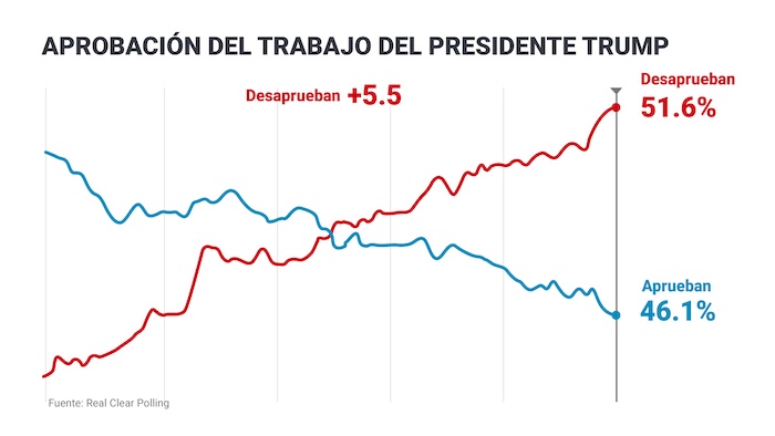 Según Real Clear Polling, un ponderado de encuestas, aprueba a Trump 46.1 por ciento de los estadounidenses mientras que 51.6 por ciento lo rechaza. El dato de Fox News es todavía más dramático: un 44 por ciento de los ciudadanos lo acepta, pero 55 por ciento lo rechaza. La distancia entre un dato y otro es de 11 puntos porcentuales. Fox News es la empresa de medios en la que el Presidente estadounidense confía más.
